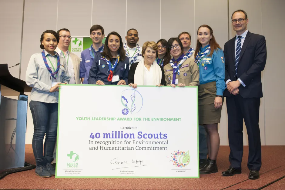 On Tuesday morning, Corinne Lepage, Advisor to French President François Hollande on the Rights of Humanity and Adam Koniuszewski, Chief Operating Officer of Green Cross International presented the award to six Scout ambassadors on behalf of every Scout around the world for their continuous actions to make our global environment a better place to live in.